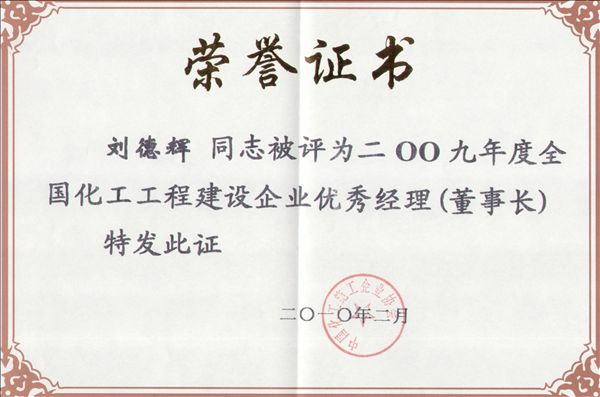 近日,經(jīng)中國(guó)化工施工企業(yè)協(xié)會(huì)評(píng)定,公司榮獲2009年度全國(guó)化工工程建設(shè)優(yōu)秀企業(yè),公司總經(jīng)理、黨委書記劉德輝榮獲“2009年度全國(guó)化工施工企業(yè)優(yōu)秀經(jīng)理(董事長(zhǎng))”光榮稱號(hào)。