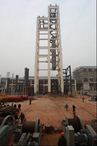 校正、對眼、插螺栓、緊固螺母、松鋼絲繩……2010年12月13日下午5點,隨著最后一顆螺帽的擰緊、固定,金象18·30氨合成塔成功吊裝就位,聲聲鞭炮陣陣禮花在寒風(fēng)中歡快地歌唱。