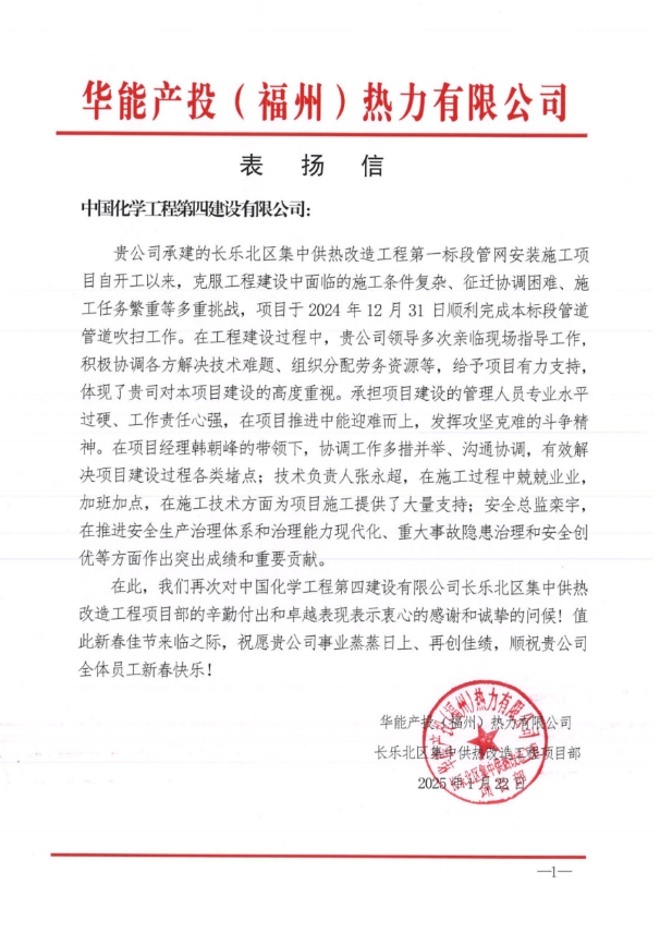 近日,東北公司收到華能產(chǎn)投(福州)熱力有限公司發(fā)來的表揚信,對東北公司在項目建設(shè)中高質(zhì)高效完成施工任務(wù)給予高度肯定與誠摯感謝。