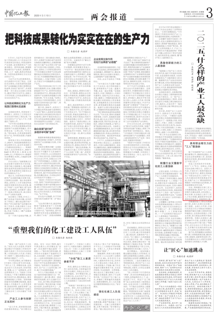 3月10日,中國化工報以《二O二五,什么樣的產(chǎn)業(yè)工人最急缺》為題報道周鴻的建議。