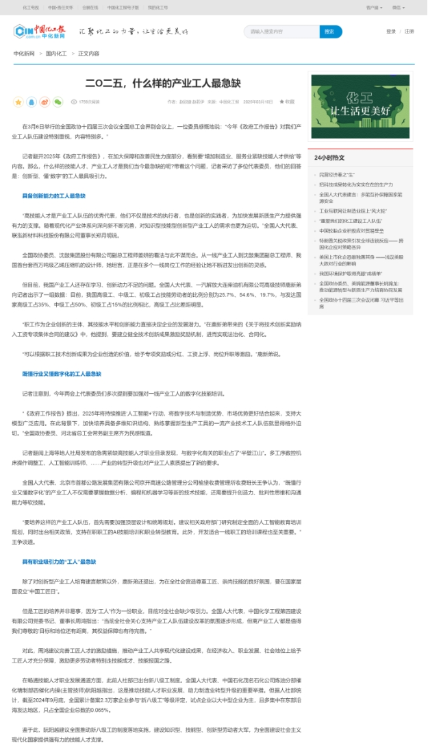 3月10日,中化新網(wǎng)以《二O二五,什么樣的產(chǎn)業(yè)工人最急缺》為題報道周鴻的建議。