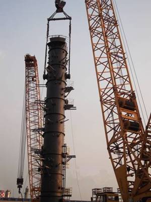 7月22日,江蘇分公司張家港項(xiàng)目部華昌化工原料結(jié)構(gòu)調(diào)整技術(shù)改造二期(凈化)項(xiàng)目現(xiàn)場(chǎng),經(jīng)過1天緊張有序的檢查確認(rèn),在確保設(shè)備符合吊裝條件后,吊裝總指揮一聲令下,華昌化工二期凈化洗滌塔Ⅰ(第一段256噸)在650噸履帶吊主吊和280噸履帶吊輔吊的吊裝下順利吊裝就位,拉開了該裝置大型設(shè)備吊裝的序幕。