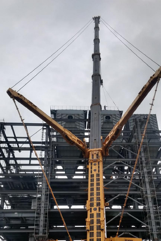 據(jù)了解,該設(shè)備單套重56噸,共3套,安裝高度51米,由1臺(tái)750噸汽車吊主吊和一臺(tái)130噸汽車吊溜尾相互配合移位吊裝。為克服雷雨天氣頻繁、施工環(huán)境復(fù)雜、作業(yè)窗口期短、安裝高度高等困難,高標(biāo)準(zhǔn)、高質(zhì)量完成吊裝施工任務(wù),項(xiàng)目部提前統(tǒng)籌、合理安排,成立設(shè)備吊裝專項(xiàng)突擊隊(duì),協(xié)調(diào)業(yè)主、監(jiān)理單位共同制定吊裝計(jì)劃,統(tǒng)籌安排對(duì)班組進(jìn)行安全技術(shù)交底,細(xì)化各項(xiàng)安全措施。