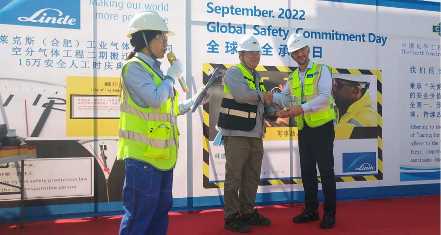 9月19日下午,華東公司普萊克斯(合肥)工業(yè)氣體有限公司空分氣體工程二期搬遷項目在現(xiàn)場舉行15萬安全工時慶典。業(yè)主林德亞太區(qū)總監(jiān)羅伯特出席慶典。