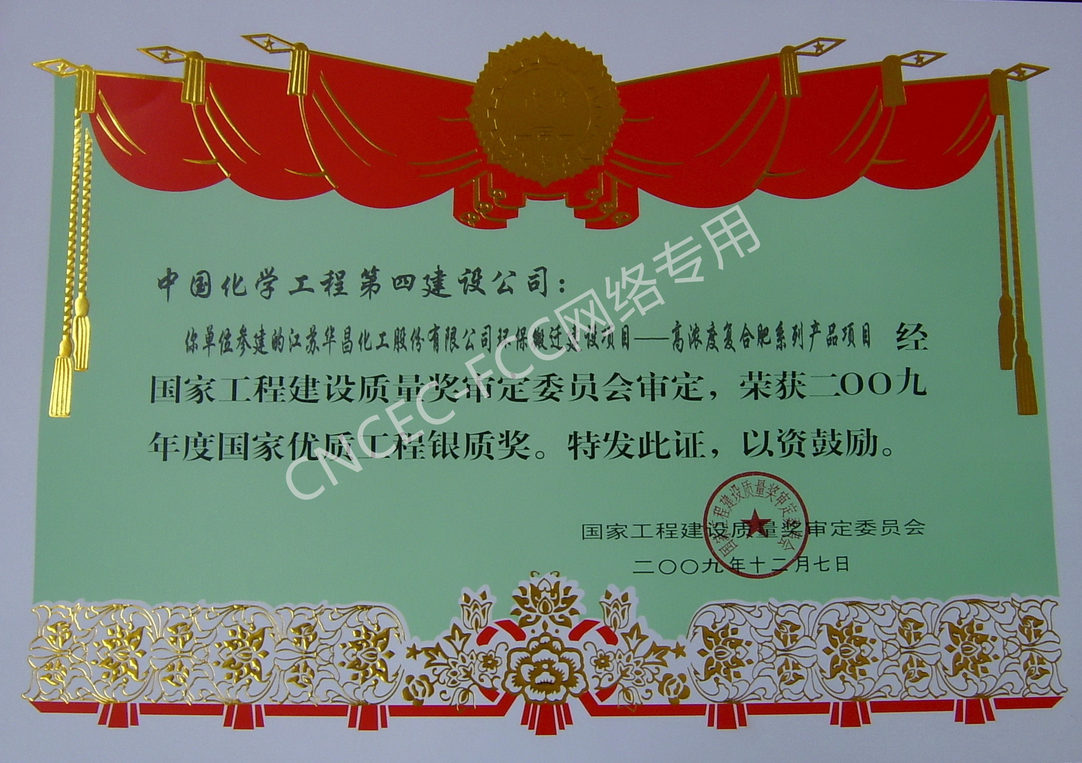 江蘇華昌化工股份有限公司環(huán)保搬遷建設(shè)項目—高濃度復(fù)合肥系列產(chǎn)品項目國家優(yōu)質(zhì)工程銀質(zhì)獎